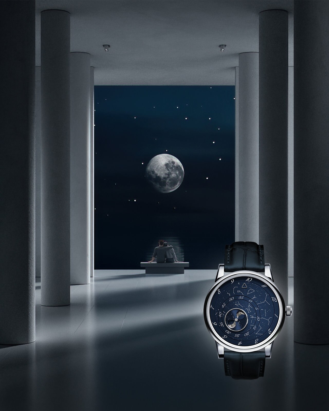 Trilobe takes poetry to a higher level and enters the world of poetical horological complications with a timepiece, “The Exquisite Hour”, adorned with a moon phase. An enchanting celestial door opens at the heart of the dial. It reveals a ballet of stars dancing on a sapphire crystal to the rhythm of the seconds. Beneath this celestial waltz, two moons intertwine in a cadenced you-and-me to the rhythm of the new X-Centric calibre. This edition limited to 100 pieces comes in three variations with sand-blasted dials: Dune, Blue and Secret.